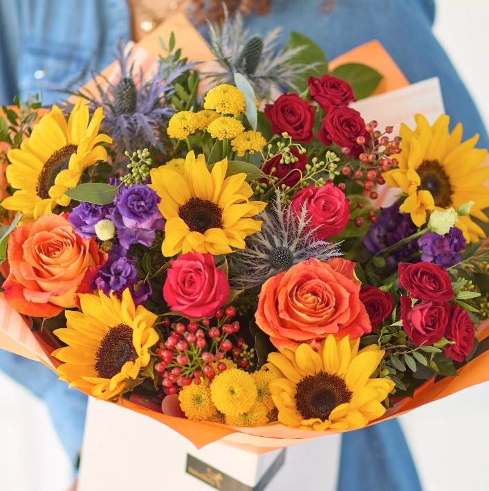 Our grandest autumn bouquet this one is a riot of colour and joy. It’s all about celebrating the rich jewel tones we find this time of year, plus capturing the last of the sunshine. It’ll feature flowers in vivid shades like ruby, amber, mustard and plum, plus at least five joyous sunflowers.